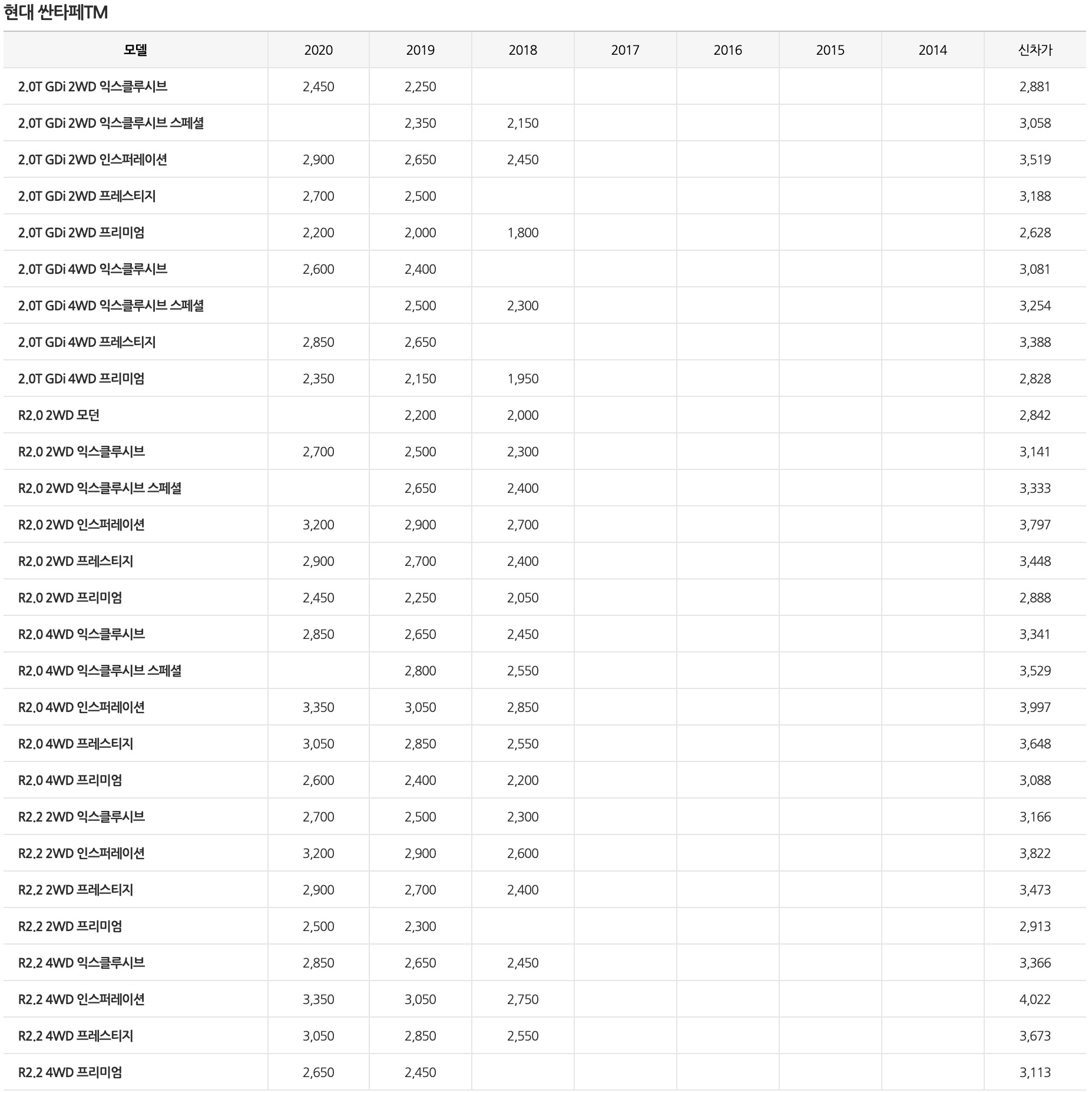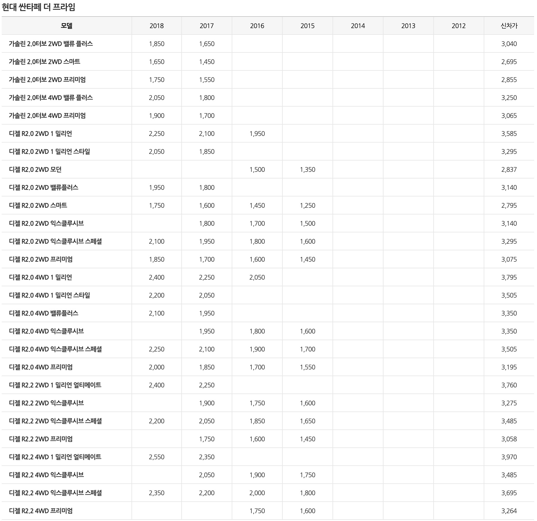 싼타페 중고차 시세표 및 가격표