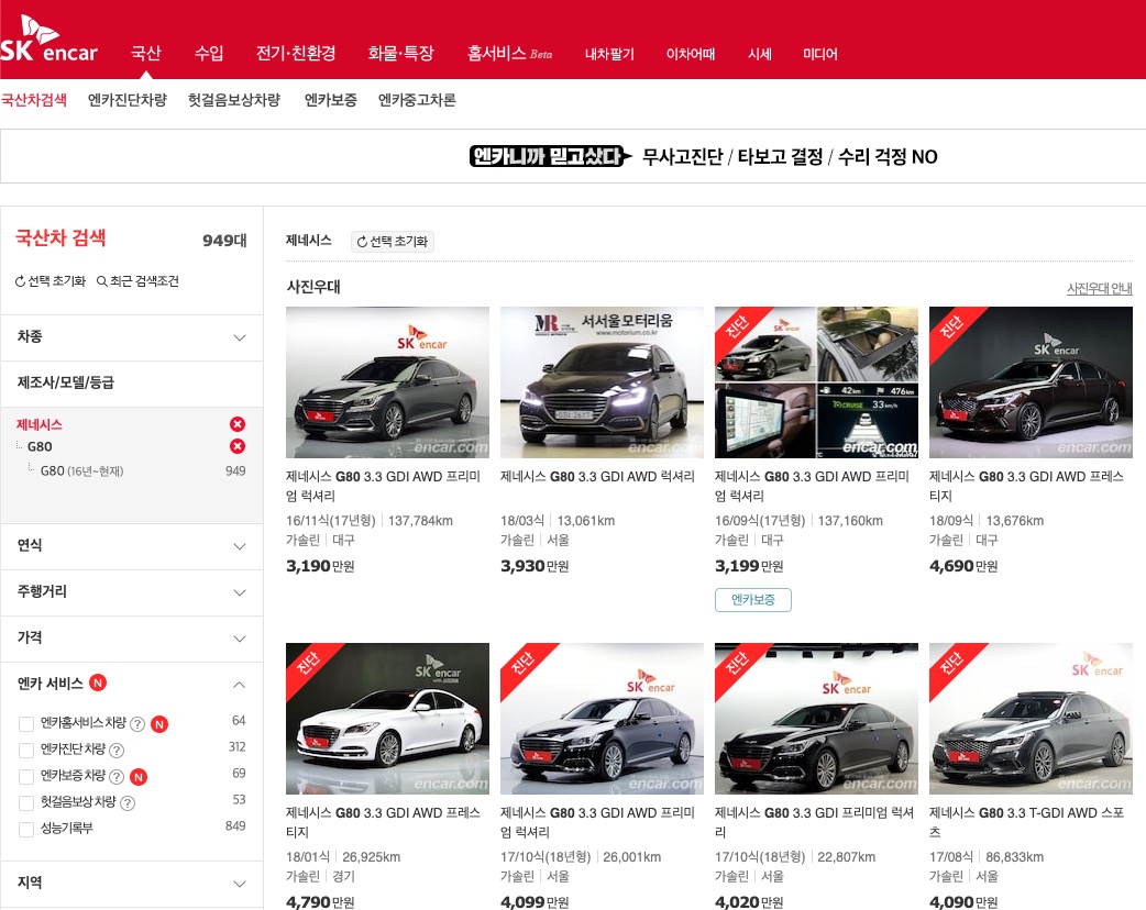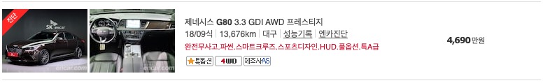 보배드림에 올라와 있는 중고차 대수 입니다. 제네시스 G80 이 60 대 정도 등록되어 있음을 알 수 있습니다. SK 중고차와 보배드림의 구분이 다른 것을 볼 수 있습니다. SK 는 연식 중점으로 나누었지만, 보배드림은 자동차 등급에 의해 나눈 것을 알 수 있습니다.